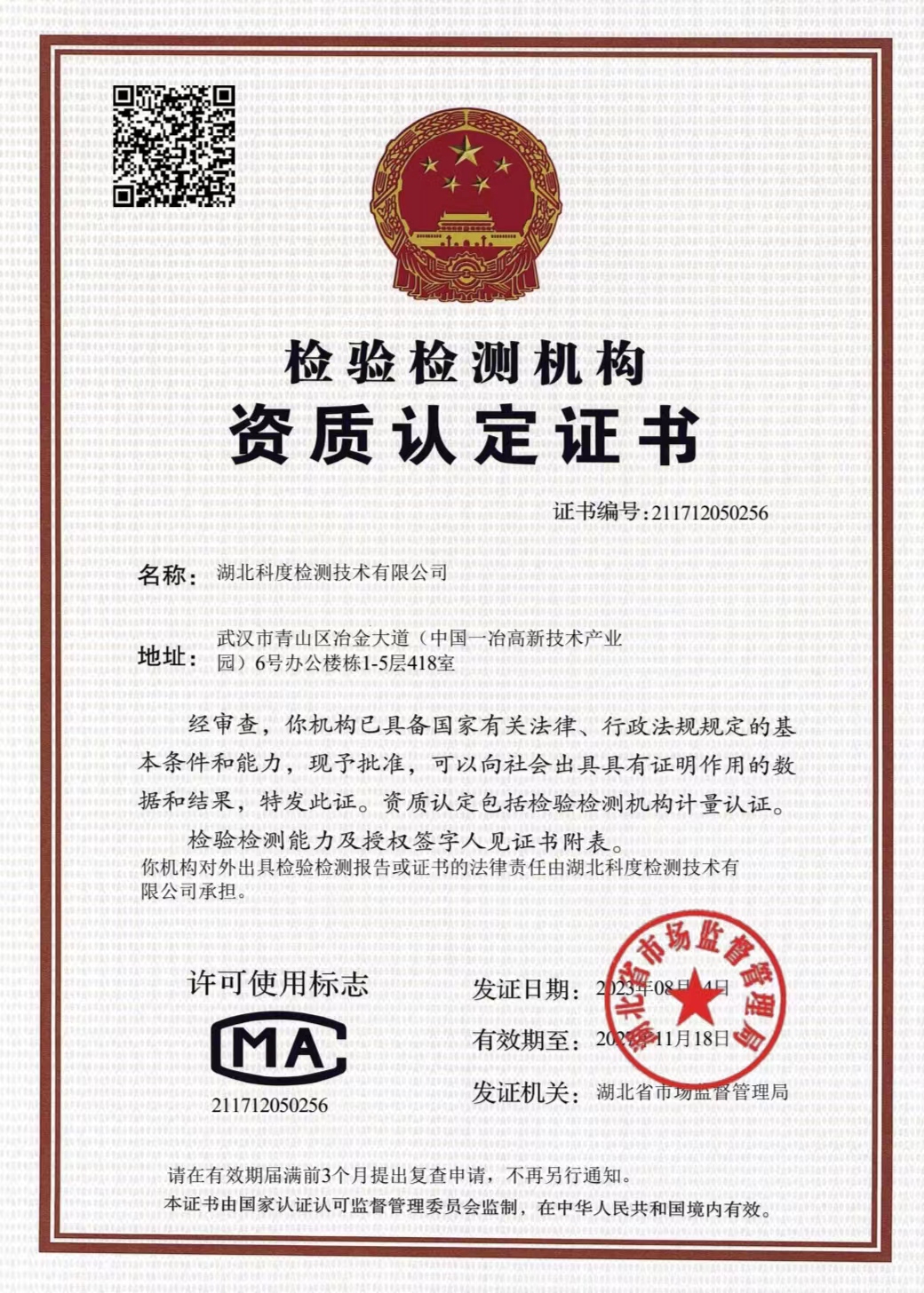 湖北科度檢測技術(shù)有限公司是一家專業(yè)從事環(huán)境類及相關(guān)領(lǐng)域檢測的第三方檢測機構(gòu),公司已通過湖北省市場監(jiān)督管理局CMA計量認證,可以面向社會出具權(quán)威CMA檢測報告。 我公司實驗室嚴格按照國家標(biāo)準建設(shè),擁有一大批國內(nèi)外先進儀器設(shè)備及現(xiàn)代化配套設(shè)施,并有經(jīng)驗豐富的中高級專業(yè)技術(shù)人員和嚴格的實驗室質(zhì)量保證體系為項目運作提供強力支撐。 作為第三方檢測機構(gòu),公司始終以高度的社會責(zé)任感經(jīng)營企業(yè),以“公正、嚴謹、高效”為宗旨,依托專業(yè)的技術(shù)實力為客戶提供專業(yè)優(yōu)質(zhì)檢測服務(wù),受到政府、企業(yè)和社會各界的廣泛關(guān)注和認可。